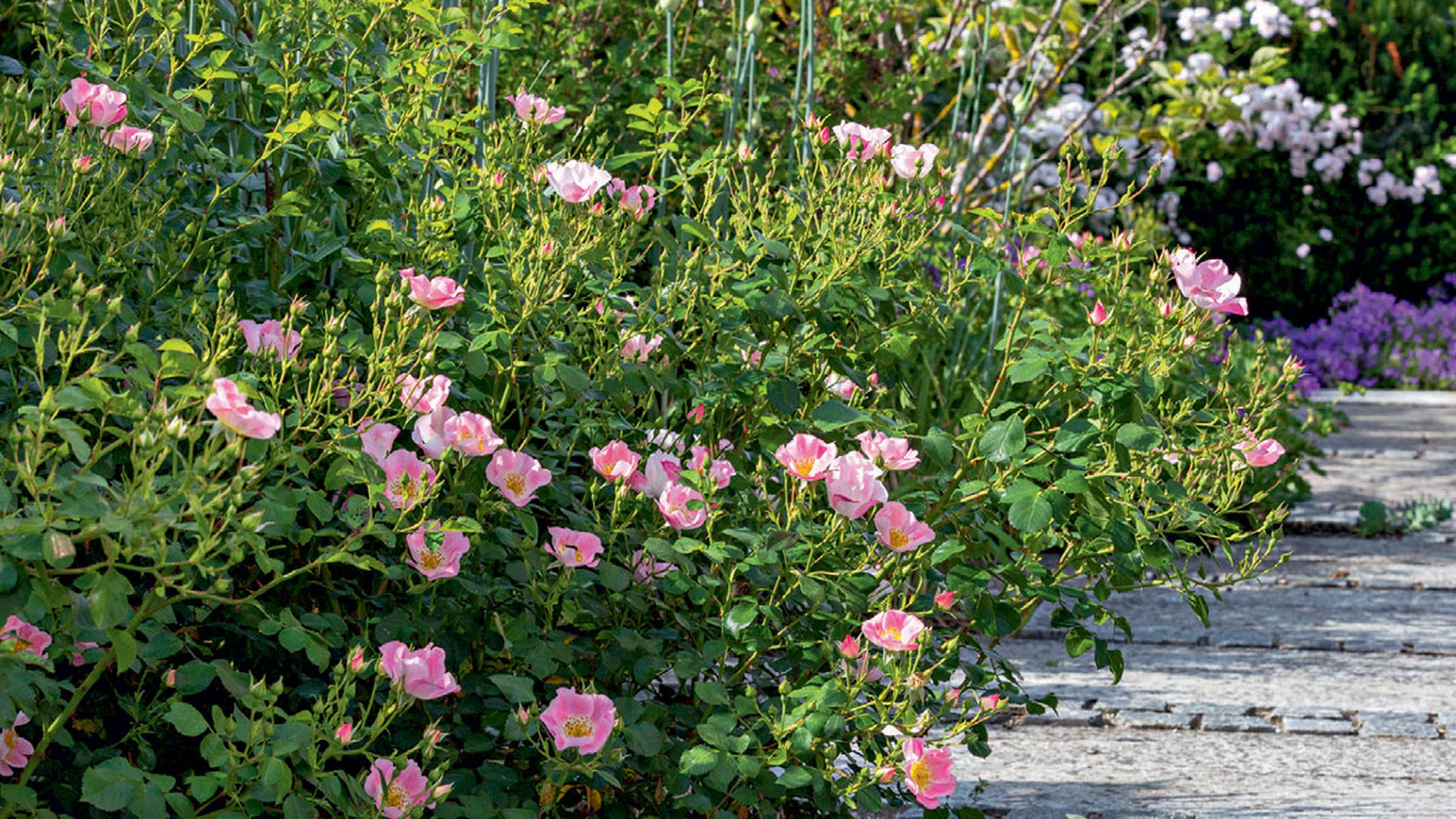 Dieser Trend betrifft auch die Rosen: für einmalblühende Strauchrosen wie beispielsweise Rosa canina oder Rambler in Riesenformat wie ’Bobby James’ ist heutzutage kaum noch Platz zu finden.