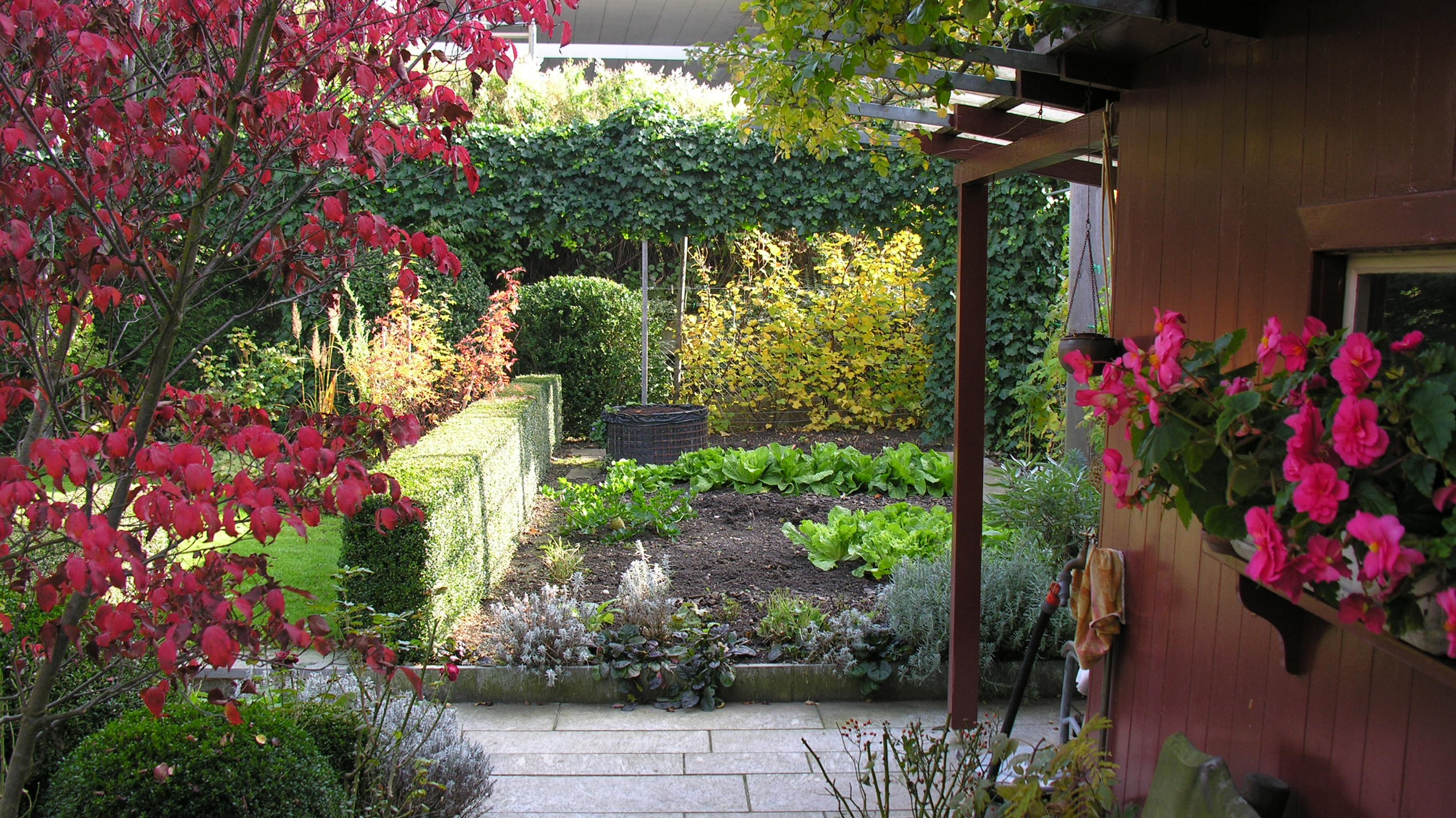 Farbwiederholung schafft Harmonie (Herbstfärbung von Cornus kousa und Begonien)