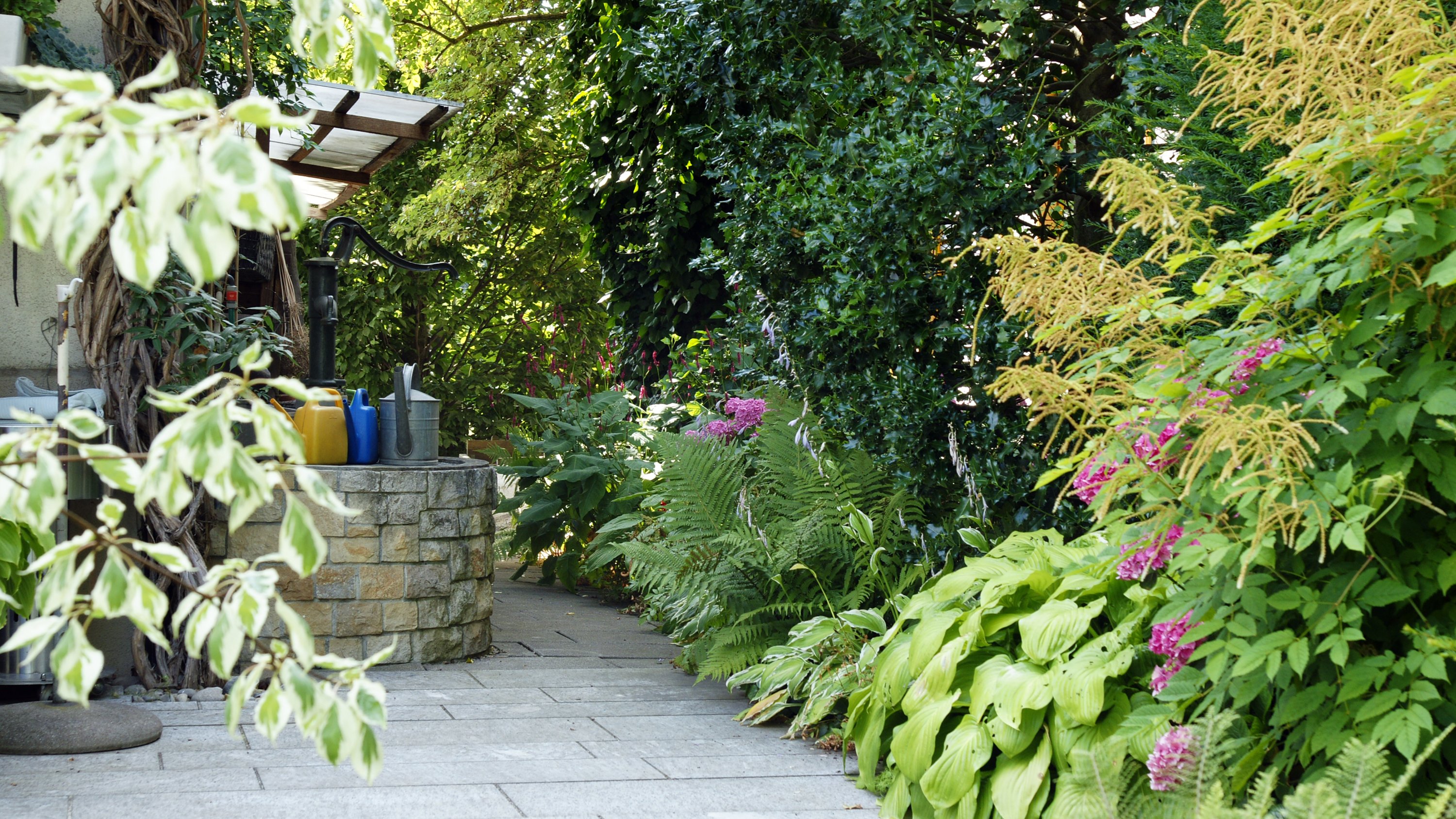 Spiel mit kontrastierenden Texturen und Grüntönen. Stechplamen, dunkelgrün und kleinlaubig, Host hellgrün und grosslaubig, im Vordergrund links Cornus controversa ‚Variegata‘ als Lichtpunkt