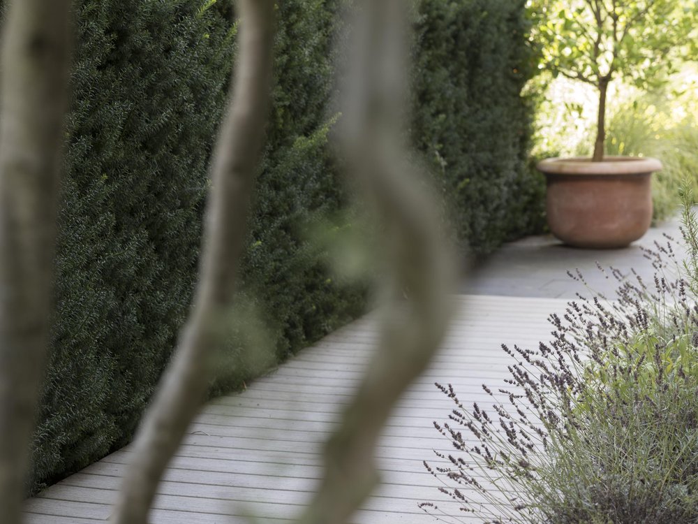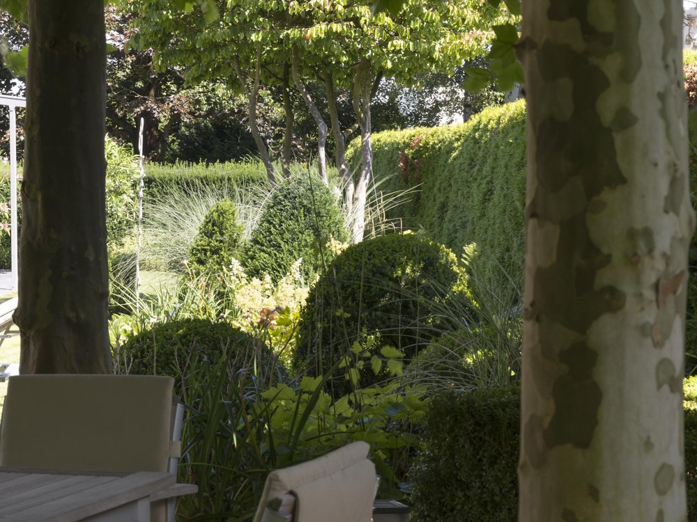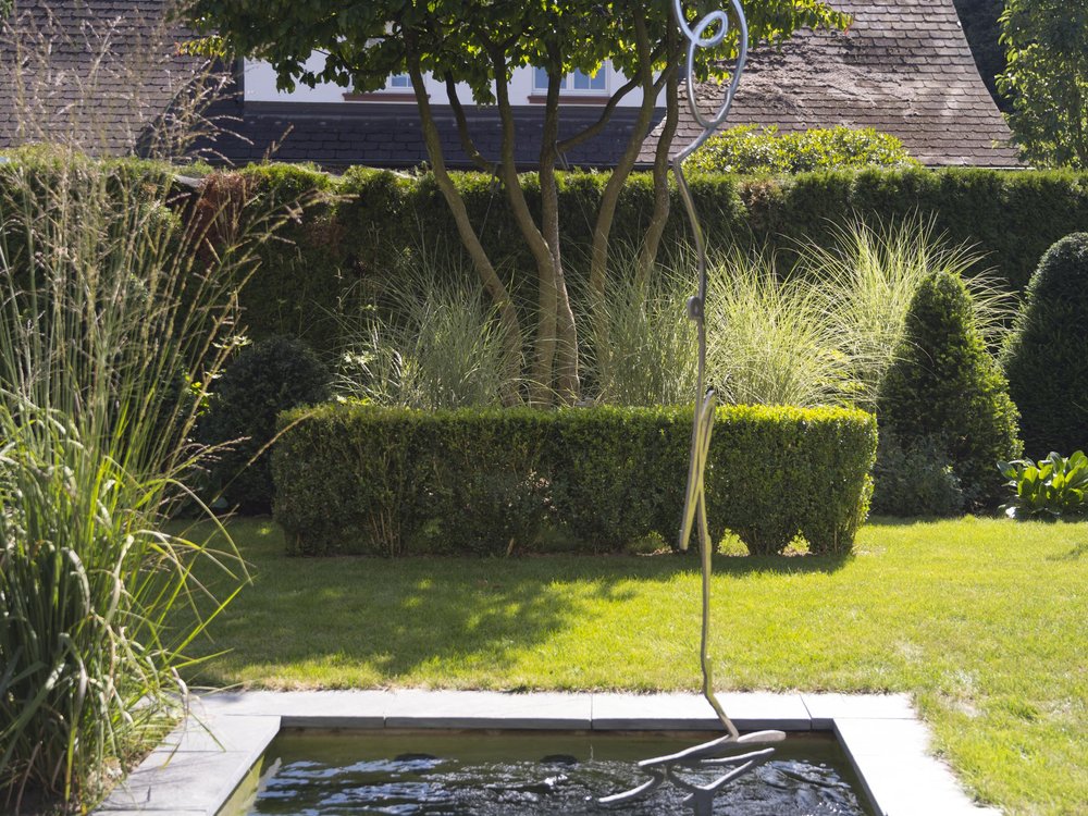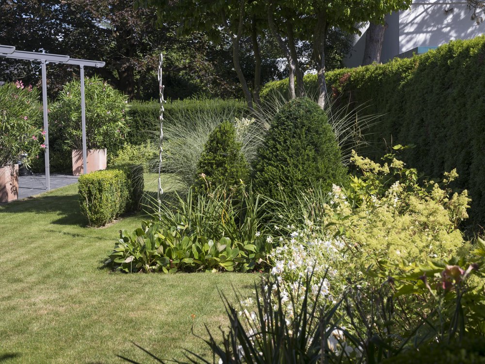 Eine Pflanzung in verschiedenen Schichten schafft Raumtiefe. Wiederholungen und Kontraste bei den Hecken und den Gräsern vereinheitlichen das Bild, sorgen aber auch für Spannung.