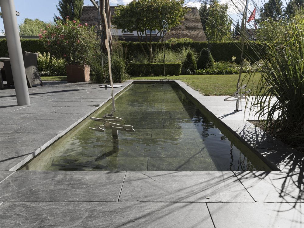 Gestalten: Die Gestaltung der Belagsfläche mit Phyllit-Schiefer wird am Beckenboden wieder aufgegriffen.