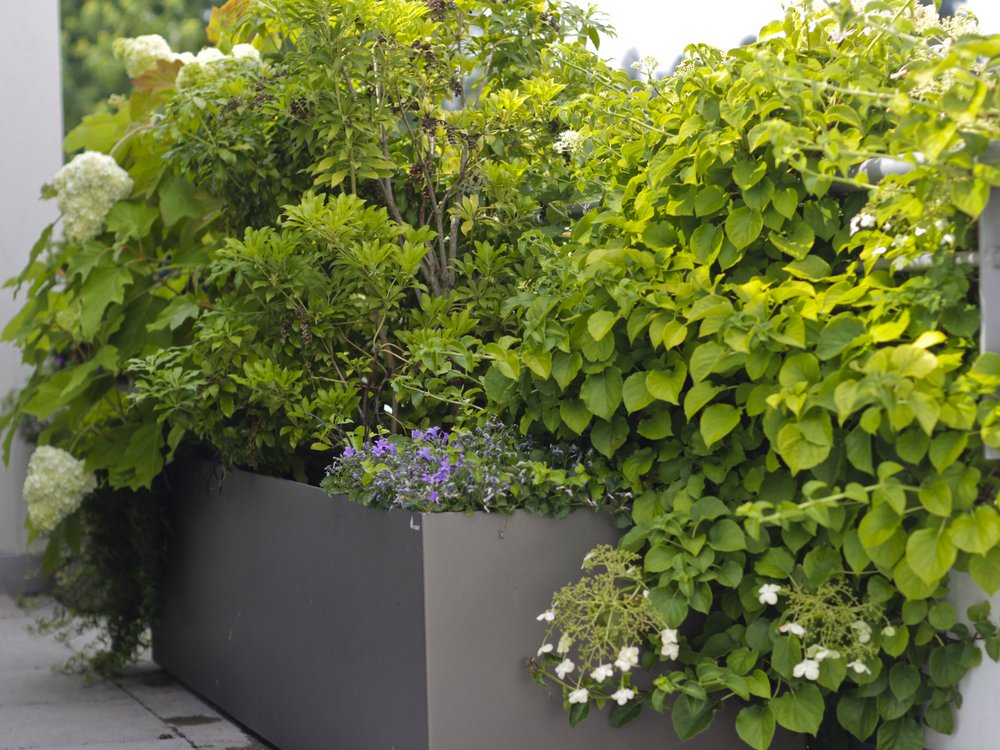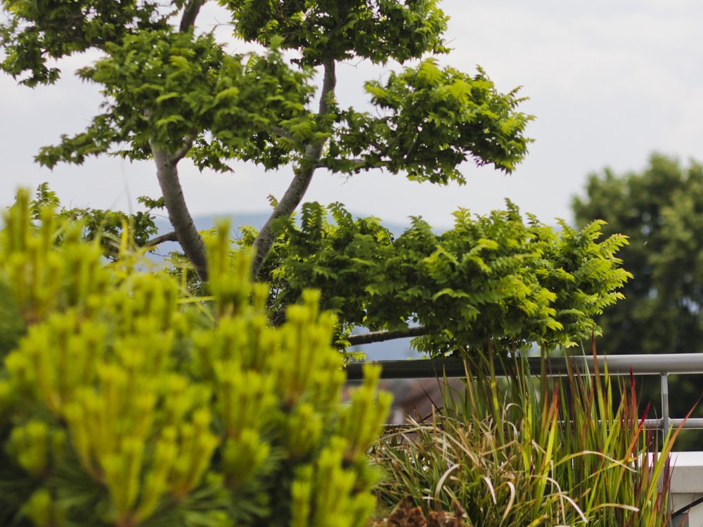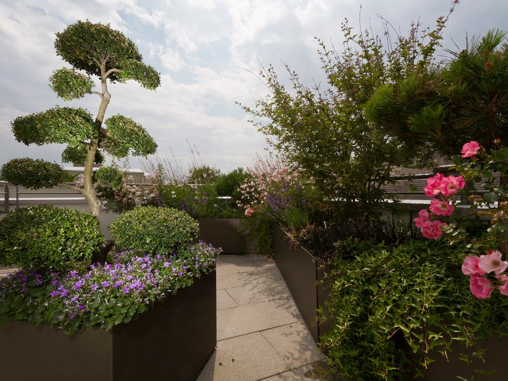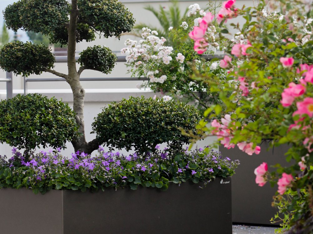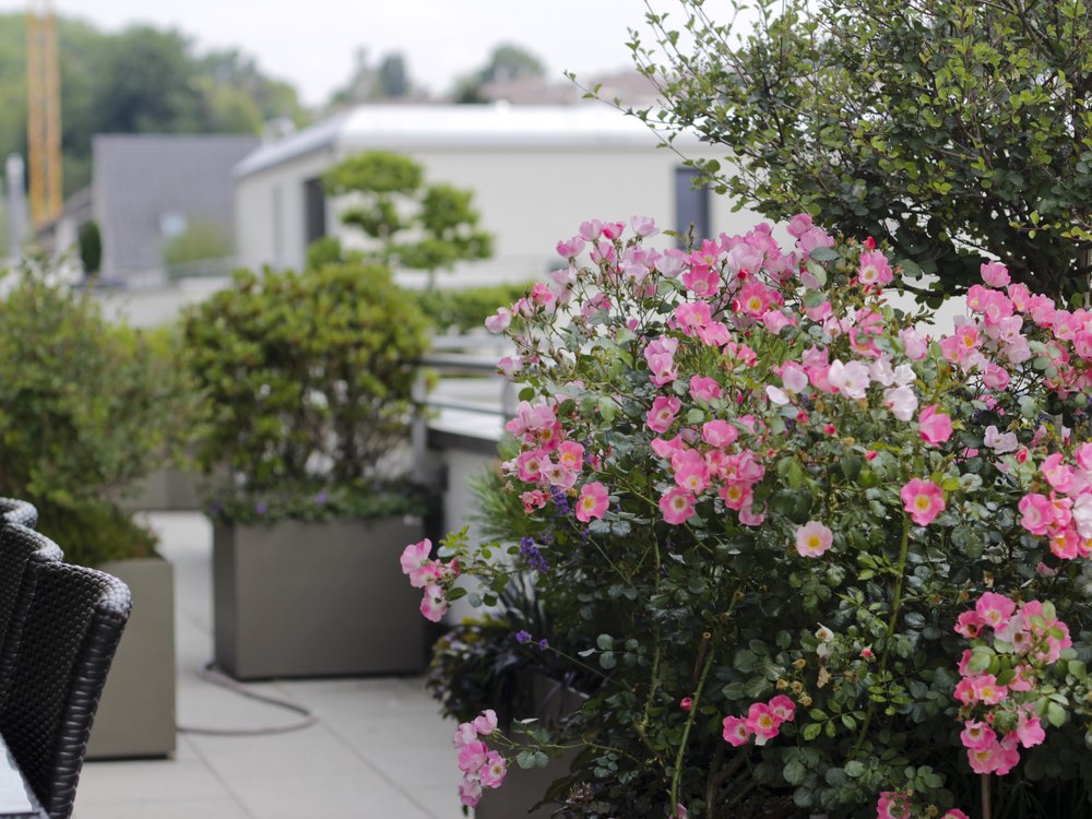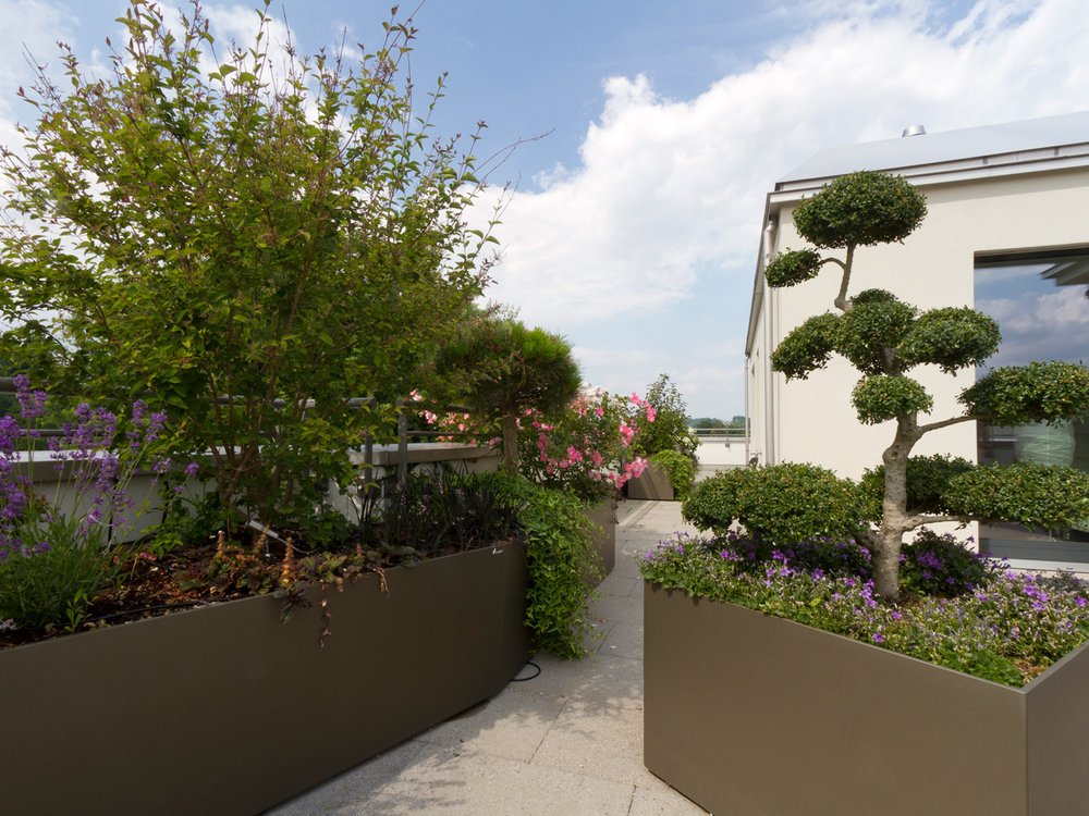 Unsere Kreativität und Erfahrung garantieren eine Gartenkultur, welche Ihnen nachhaltig Freude bereitet. Mit der Umgestaltung dieser Dachterrasse wurden neue Kontraste geschaffen. Die Blumenkästen mit ihrer amorphen Form kontrastieren die klaren Linien der Dachterrasse und bieten mit den eingebauten Rollen eine hohe Mobilität. Dadurch werden Räume mit unterschiedlichen Formen geschaffen.