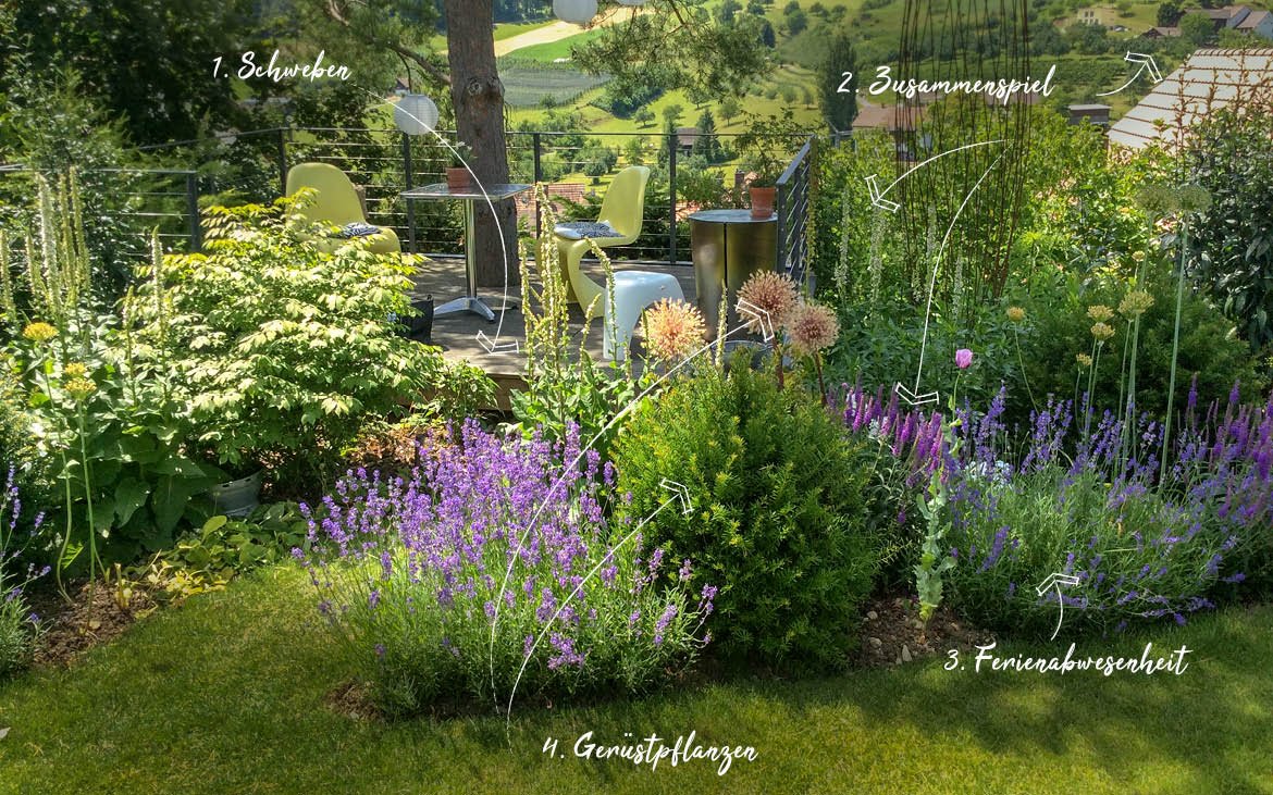 Bei einer abgestimmten Pflanzplanung spielen im Staudenbeet sehr viele Komponenten wie Blütenfarbe und -Form und Blütezeit zusammen.
