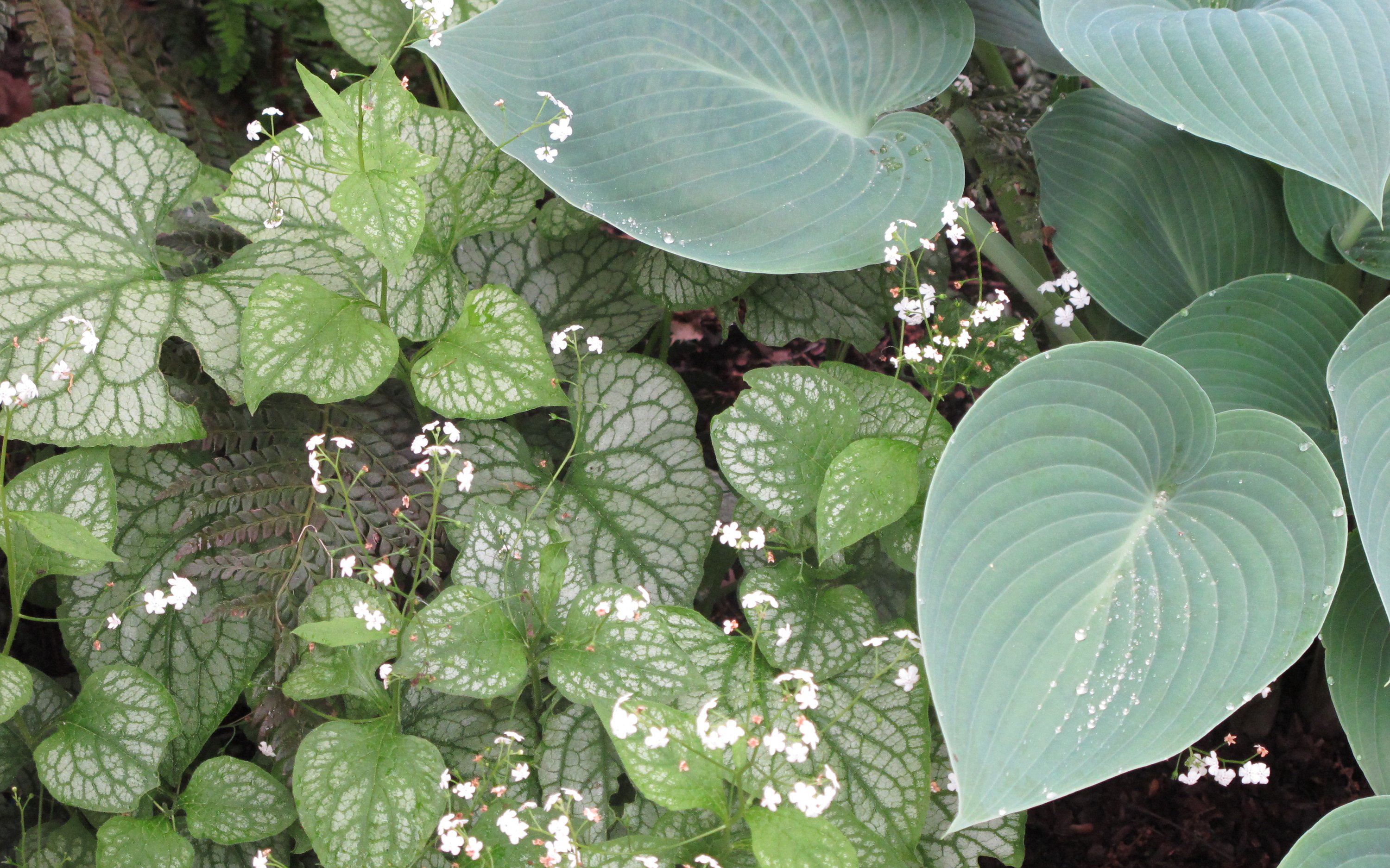 Neben den hellblauen gibt es auch weiss blühende Sorten wie ‘Betty Bowring’ und ‘Mr.Morse’. Die herzförmigen Blätter sind recht gross und behaart und leider bei Schnecken trotzdem nicht unbeliebt. Bei der Wildform sind sie grün, es gibt aber mittlerweile auch Sorten mit silbrigen Sprenkeln oder fast durchgängig silbriger Färbung wie bei ‘Jack Frost’ oder ‘Looking Glass’, sowie weiss oder gelb gerandete. Diese Sorten sind schöne Blattschmuckstauden und lassen sich super kombinieren mit anderen Halbschattengewächsen wie Farnen, Funkien, Elfenblumen und Waldgräsern. Brunnera sind robust und pflegeleicht und daher auch tolle Pflanzen für Gartenanfänger!