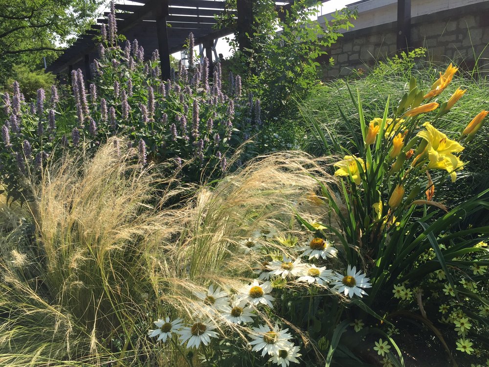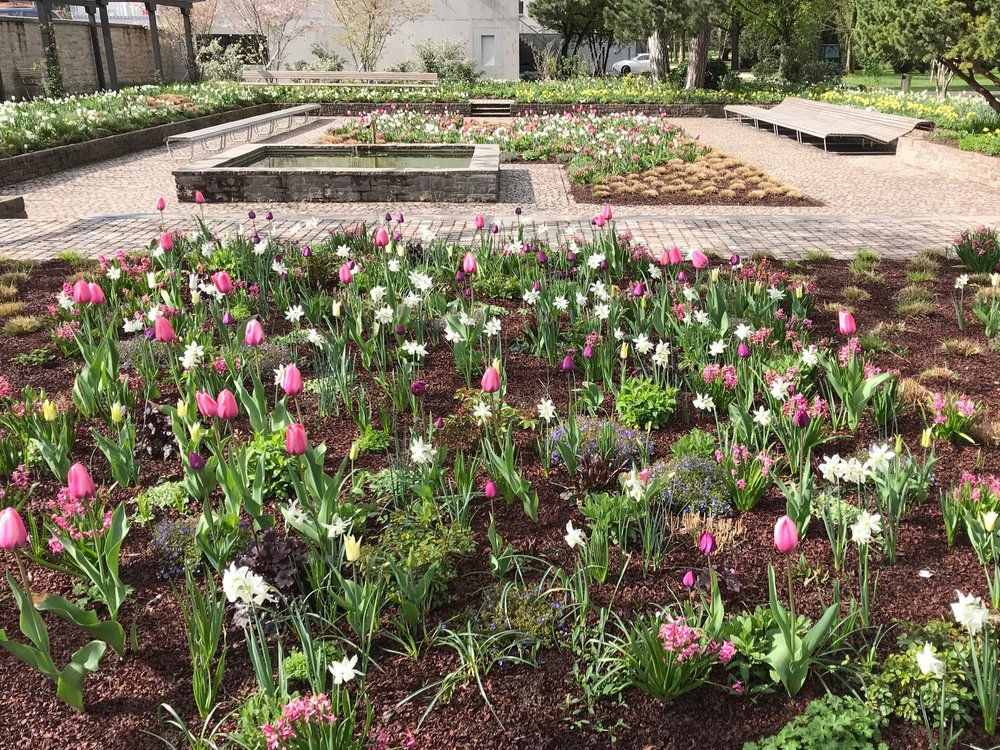 Ich wurde damals von der Stadtgärtnerei angefragt die Pflanzplanung des neuen Gartens zu übernehmen. Ziel war das Sortiment an Rosenklassen wie Kletterrosen, Strauchrosen, Beetrosen etc. zu zeigen, eingebunden in ein Gesamtdesign mit Stauden, Gräsern, Gehölzen und Zwiebelblumen. So ziehen sich nun lange Gräserbänder durch das Gelände die den Garten strukturieren und die verschiedenen Beete trennen. In den Randbereichen wurde mit sogenannten Staudenmischungen gearbeitet, die es fertig im Fachhandel zu kaufen gibt, und die die Stadtgärtnerei einmal im grösseren Masstab testen wollte. Für den zentralen Rosenbereich habe ich eigene Zusammenstellungen erarbeitet die auf speziellen Farbthemen beruhen. Von den ersten Blumenzwiebeln im Frühjahr wie Krokus, Narzissen und Tulpen bis zu Astern und Japan-Anemonen im Herbst ziehen sich diese Pflanzthemen durchs Gartenjahr. Immer blüht etwas und die Rosen verzaubern die Besucher mit Duft und Farbe von Mai bis Oktober. Aber auch der Winter ist reizvoll im Rosengarten, denn die Gräser dürfen stehen bleiben und zeichnen besonders bei Raureif und Frost ein schönes Bild.
