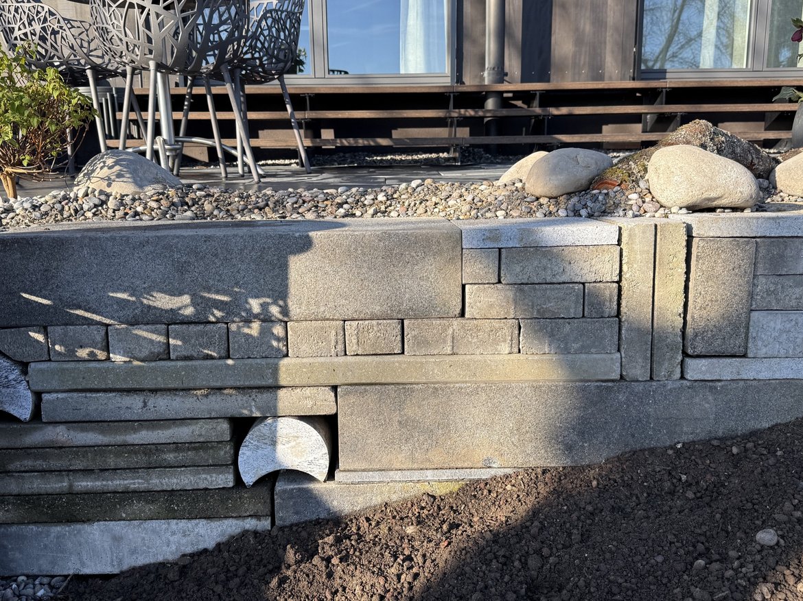 Ob direkt aus dem bestehenden Garten oder von einem anderen Projekt: Viele Natur- und Betonsteine, welche wir zurückbauen, sind qualitativ so gut, dass sie wiederverwendet werden können. Wir nutzen solche Materialien, um einzigartige Trockenmauern zu bauen, jede ein Unikat und gleichzeitig ein neuer Lebensraum für Tiere. Das fördert die Artenvielfalt und die Biodiversität.