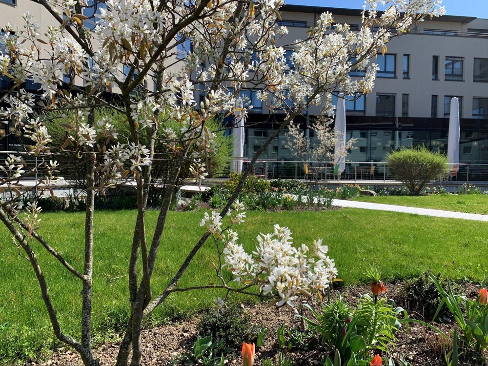 Hierbei ist vor allem der Eingangsbereich sehr wichtig, da er Besuchern einen freundlichen Empfang und den Hausbewohnern einen schönen Ausblick vom Restaurant mit Terrasse bieten soll. Das erreichen wir mit einer jahreszeitlich wechselnden Bepflanzung in schönen, fröhlichen Farben und kurzen aber häufigen Pflegeeinsätzen.
