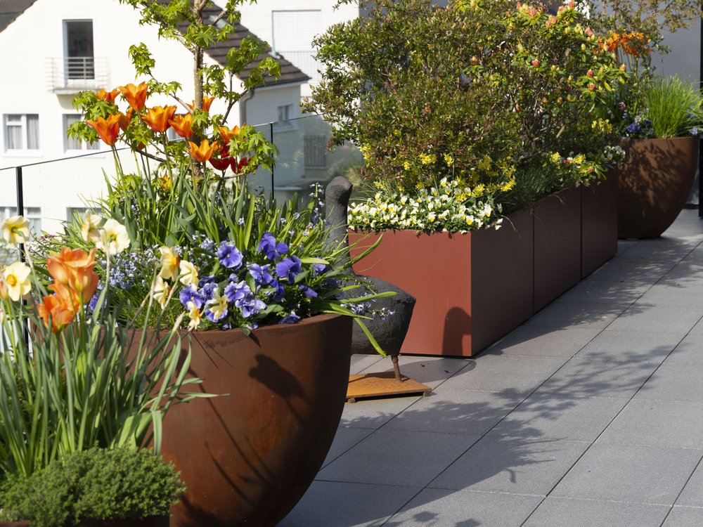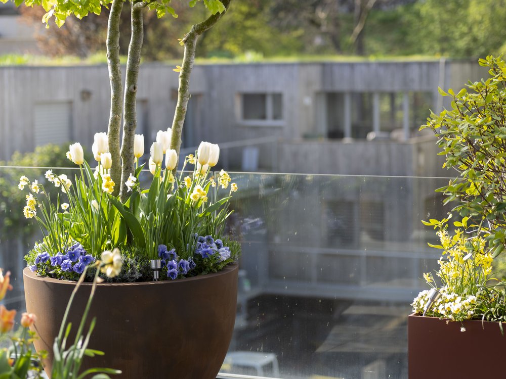 Pflanzgefässe bieten auch viele Möglichkeiten zum Spiel mit saisonaler Bepflanzung um immer wieder neue Bilder zu schaffen. Wir haben viel Erfahrung in diesem Bereich und beraten Sie gerne!