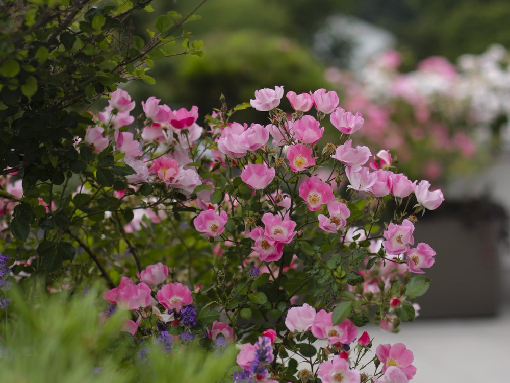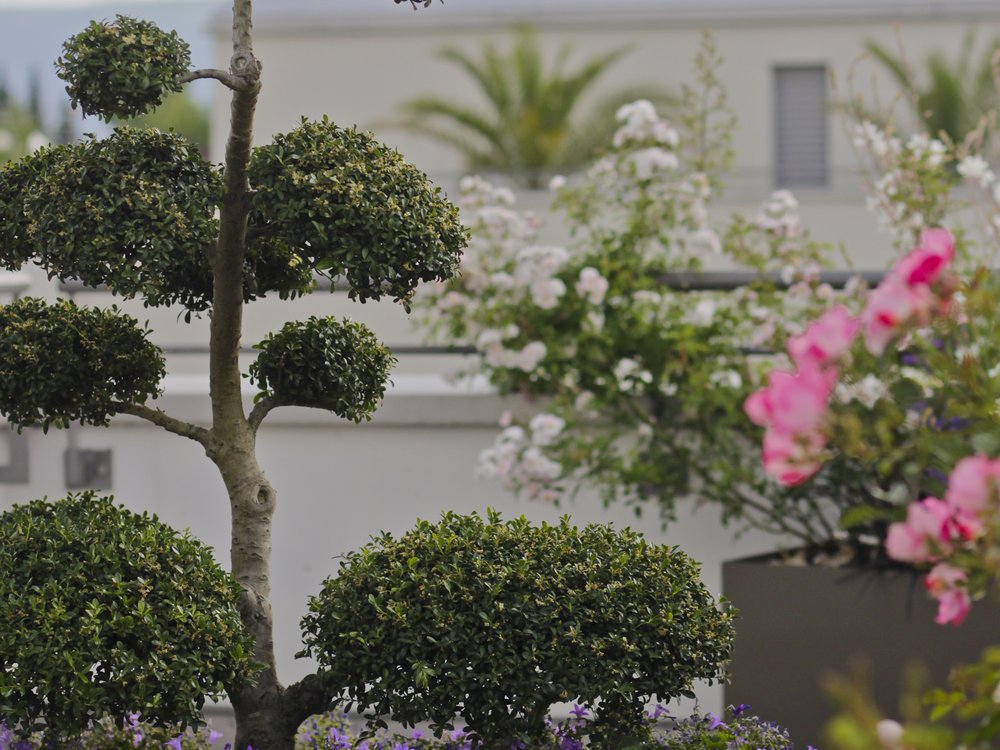 Die Mischung von geschnittenen und freien Formen der Gehölze kreiert spannende Gegensätze und verhindert ungewollte Einblicke. Zusammen mit den Stauden ergibt dies eine spannende Vielschichtigkeit auf kleinstem Raum.