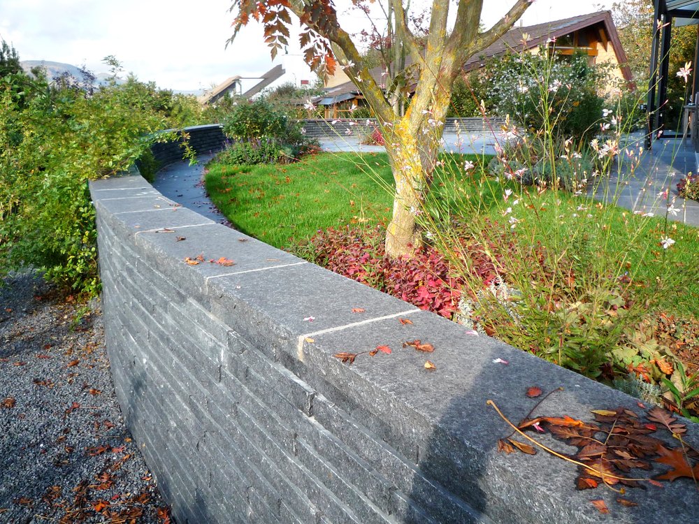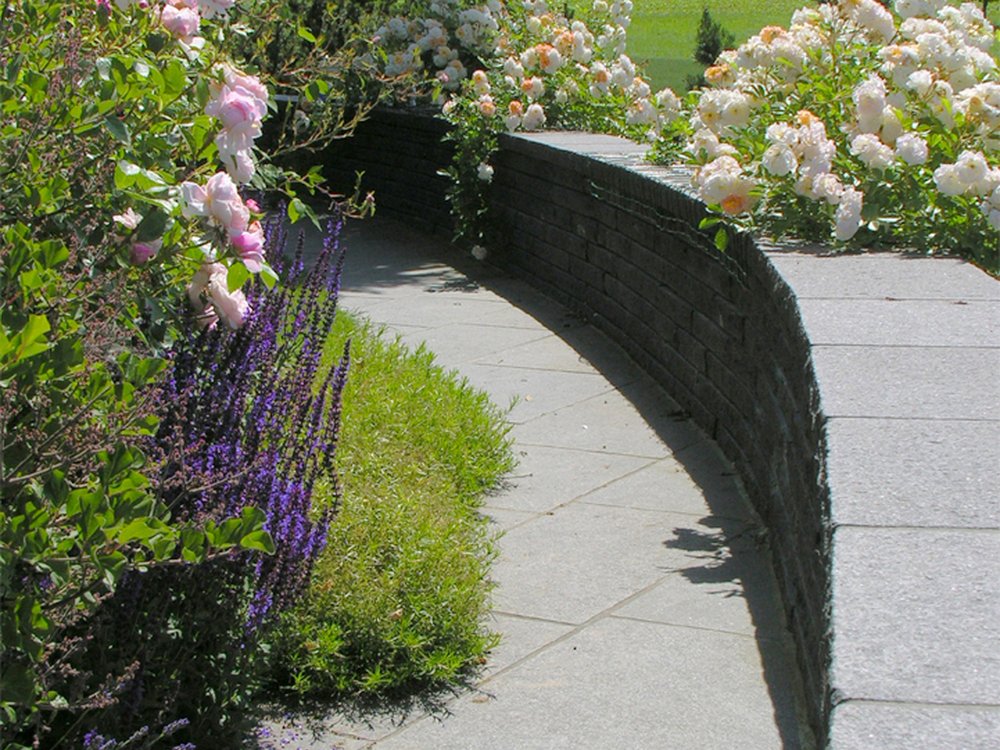 Die Mauer als architektonischer Vordergrund lässt die organischen Hügelketten im Hintergrund besonders wirken. Oberseits dient sie als Sitzmauer, stützt aber auch gleichzeitig das Terrain und strukturiert die Aussicht. Ein visuelles Spiel zwischen Vordergrund und Hintergrund.