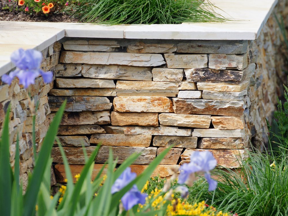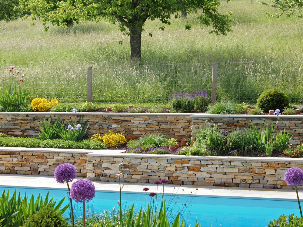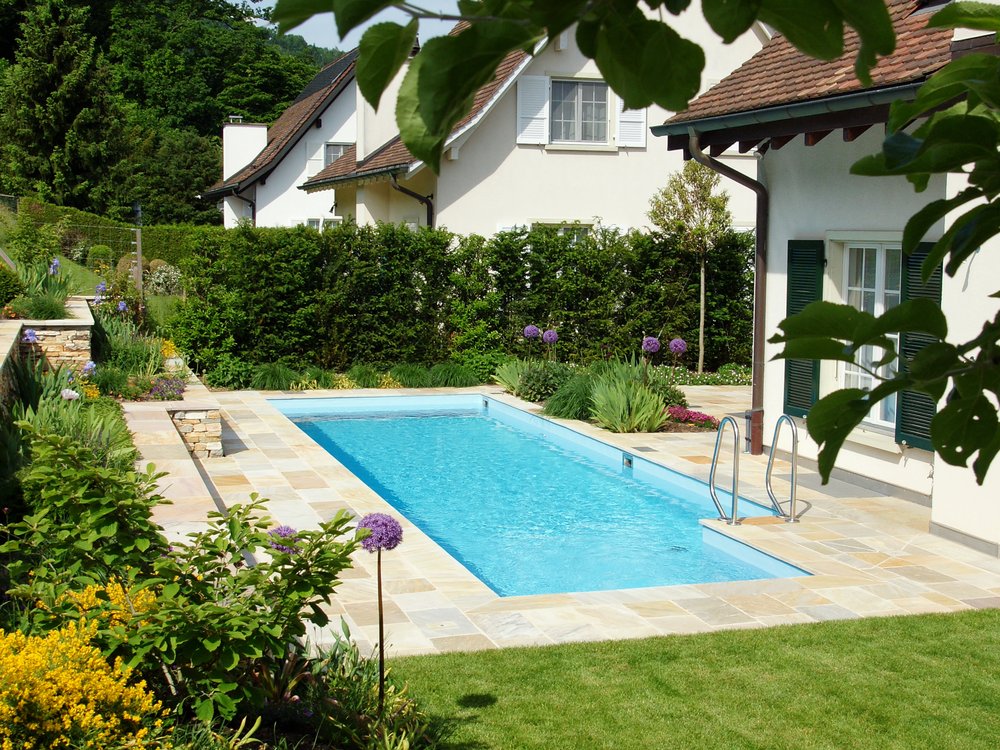 Der Ort ist geschützt vor Einblicken, und man benutzt gerne die breite Sitzmauer aus Naturstein. Eine leicht geneigte Rasenfläche führt uns zum landschaftlich gestalteten Teil des Gartens. Die Grenzen zur Nachbarschaft bestehen aus Mauern und Hecken. Hochstämmige Bäume vor diesen Elementen werden in Zukunft Teile der umliegenden Gebäude abdecken.