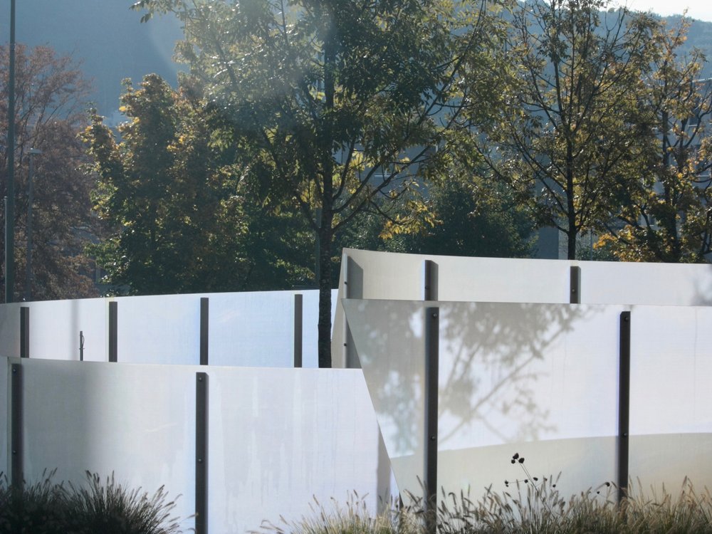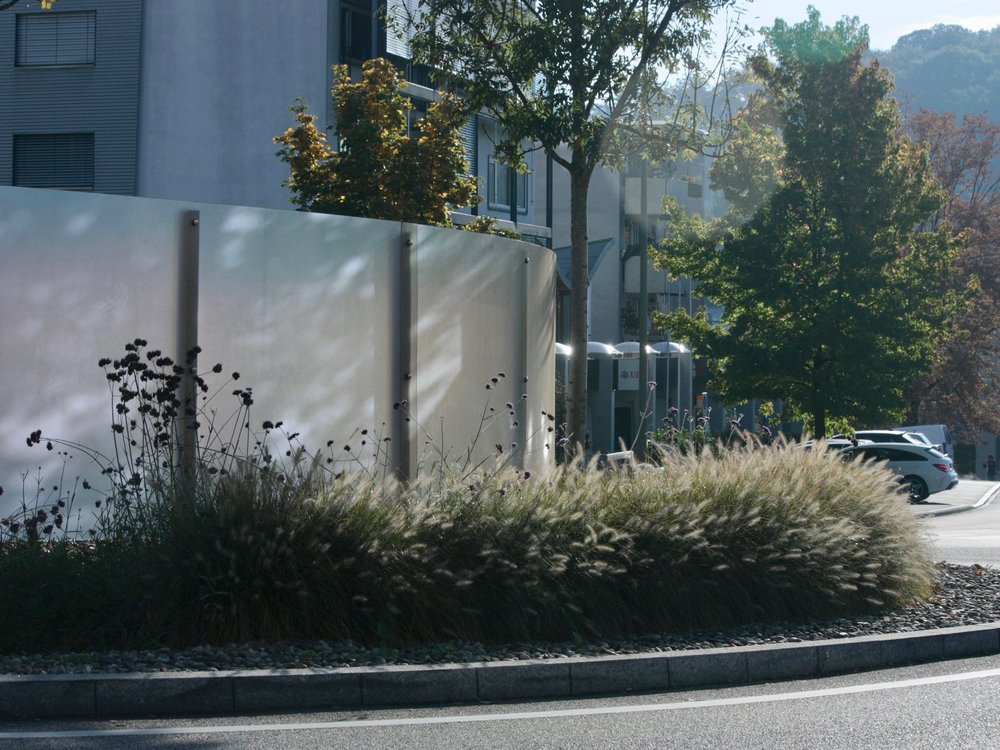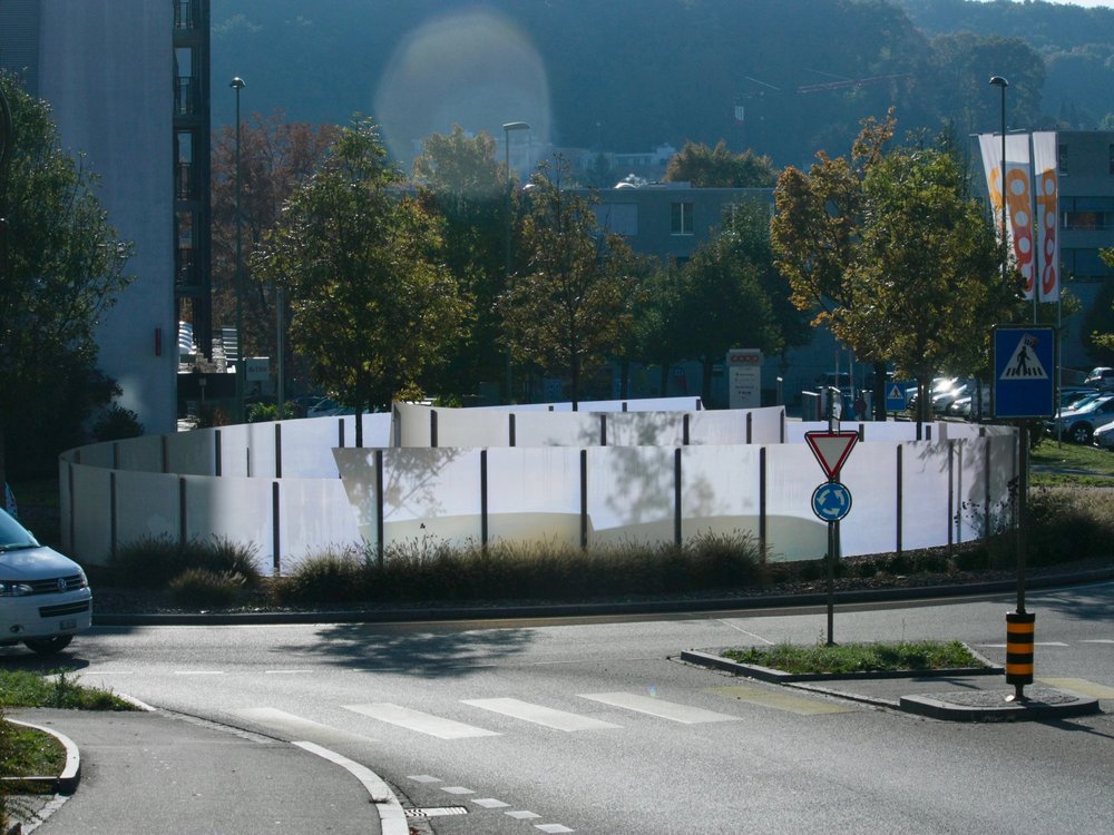 Je nach Tageszeit und Standort des Verkehrsteilnehmers präsentiert sich die Skulptur in einem völlig neuen Farben- und Lichtergewand. Die Formensprache der Skulptur erinnert zudem an das typische Oberwiler Dorfsymbol, den «Schnägg». Im Zuge der neuen Verkehrsführung rund um den Postplatzkreisel entstanden auch neue Grünflächen entlang den Verkehrswegen. Diese wurden in Kontrast zum architektonisch gestalteten Kreiselauge dicht begrünt.